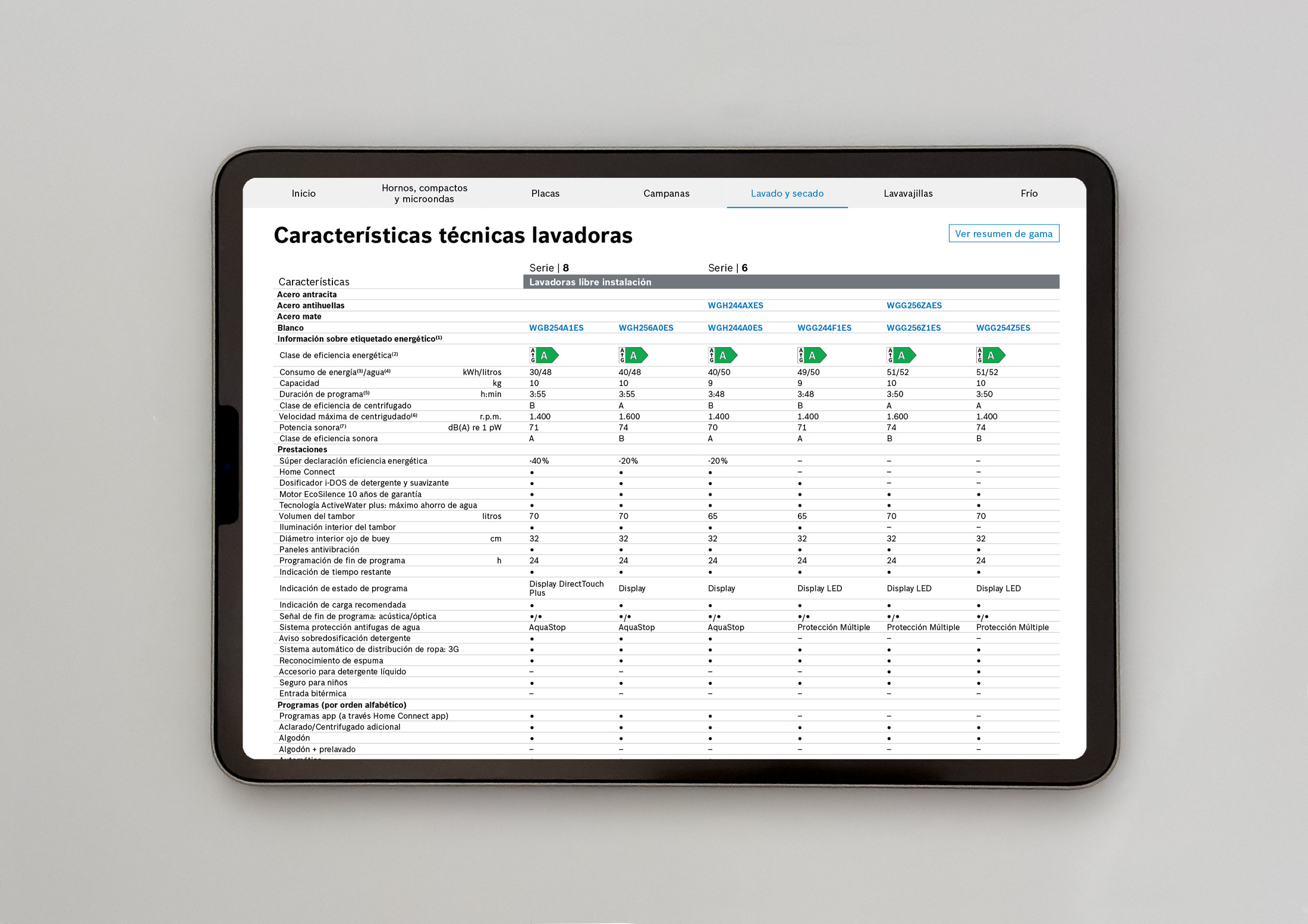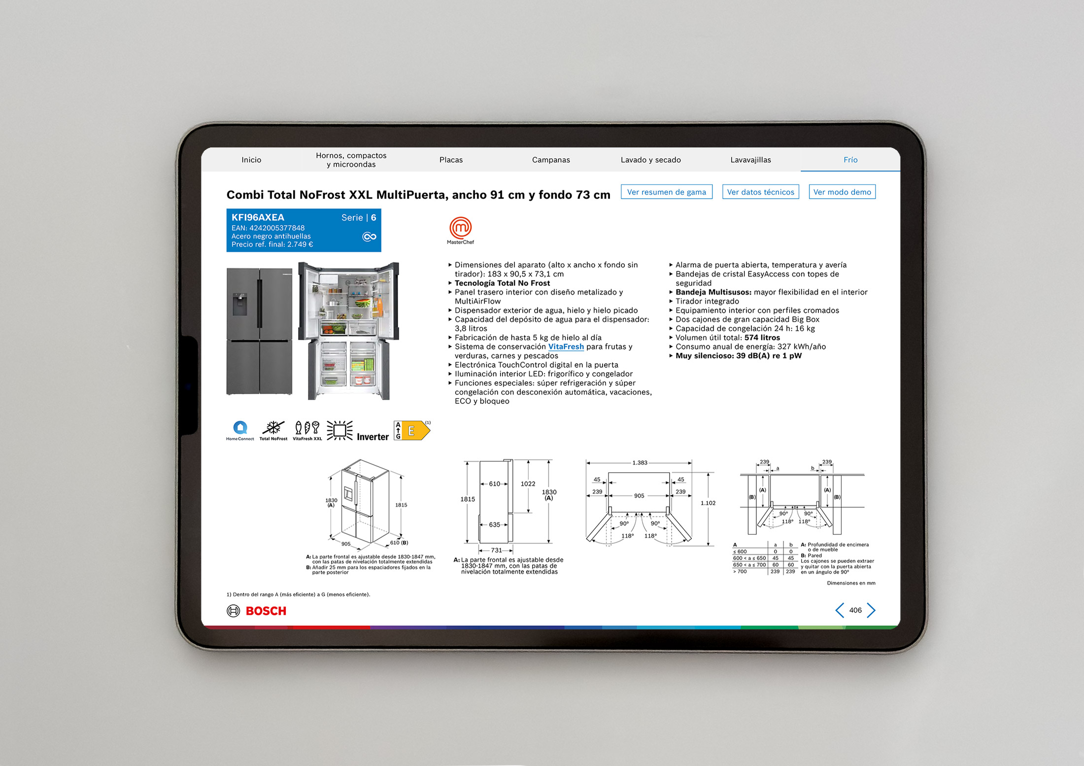 El catálogo se estructura en 6 gamas que incluyen argumentarios, resúmenes de gama, fichas de producto, planos de instalación y tablas técnicas. Los links nos permiten navegar entre los diferentes apartados y consultar los detalles de cada producto con mucha facilidad.
