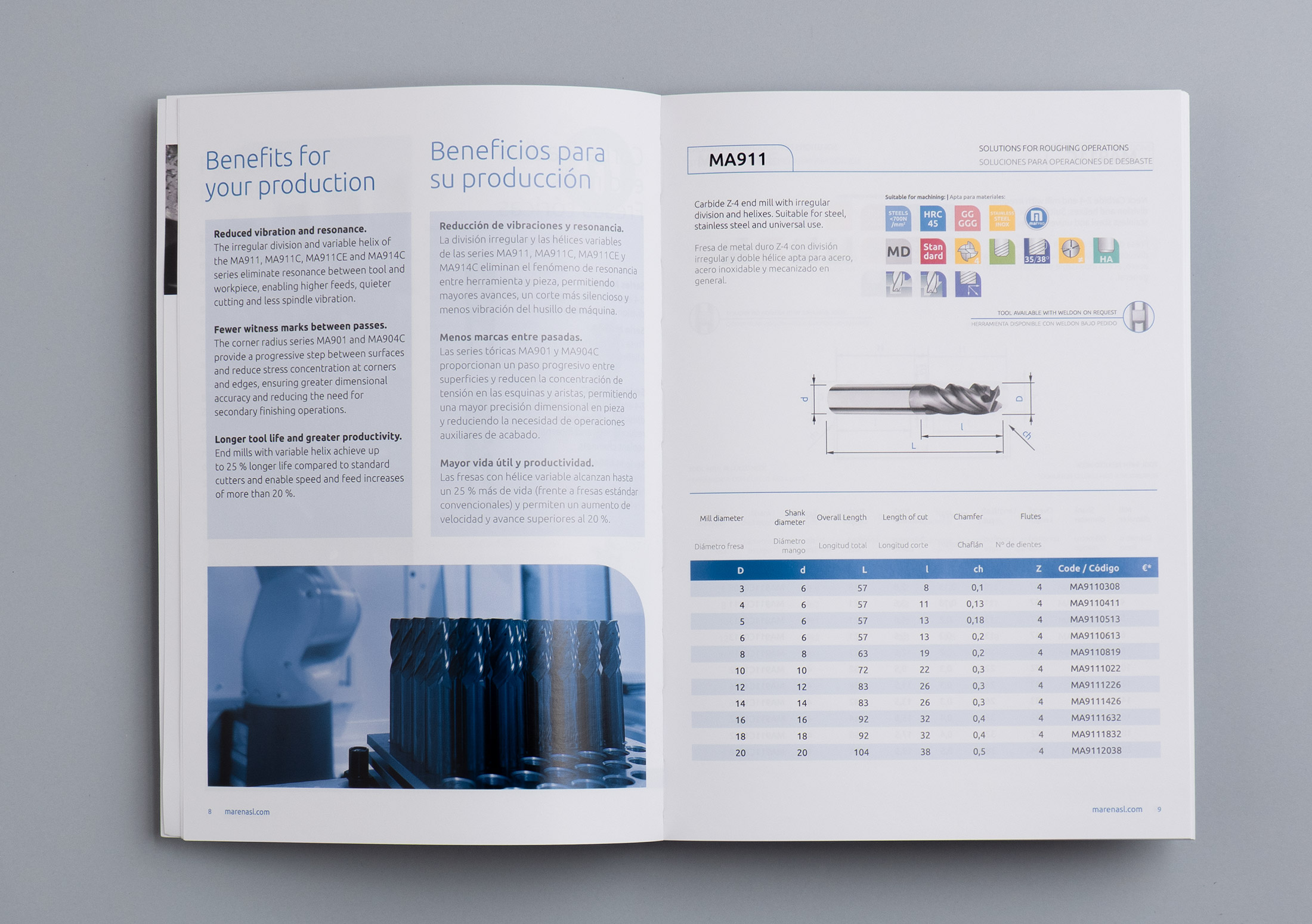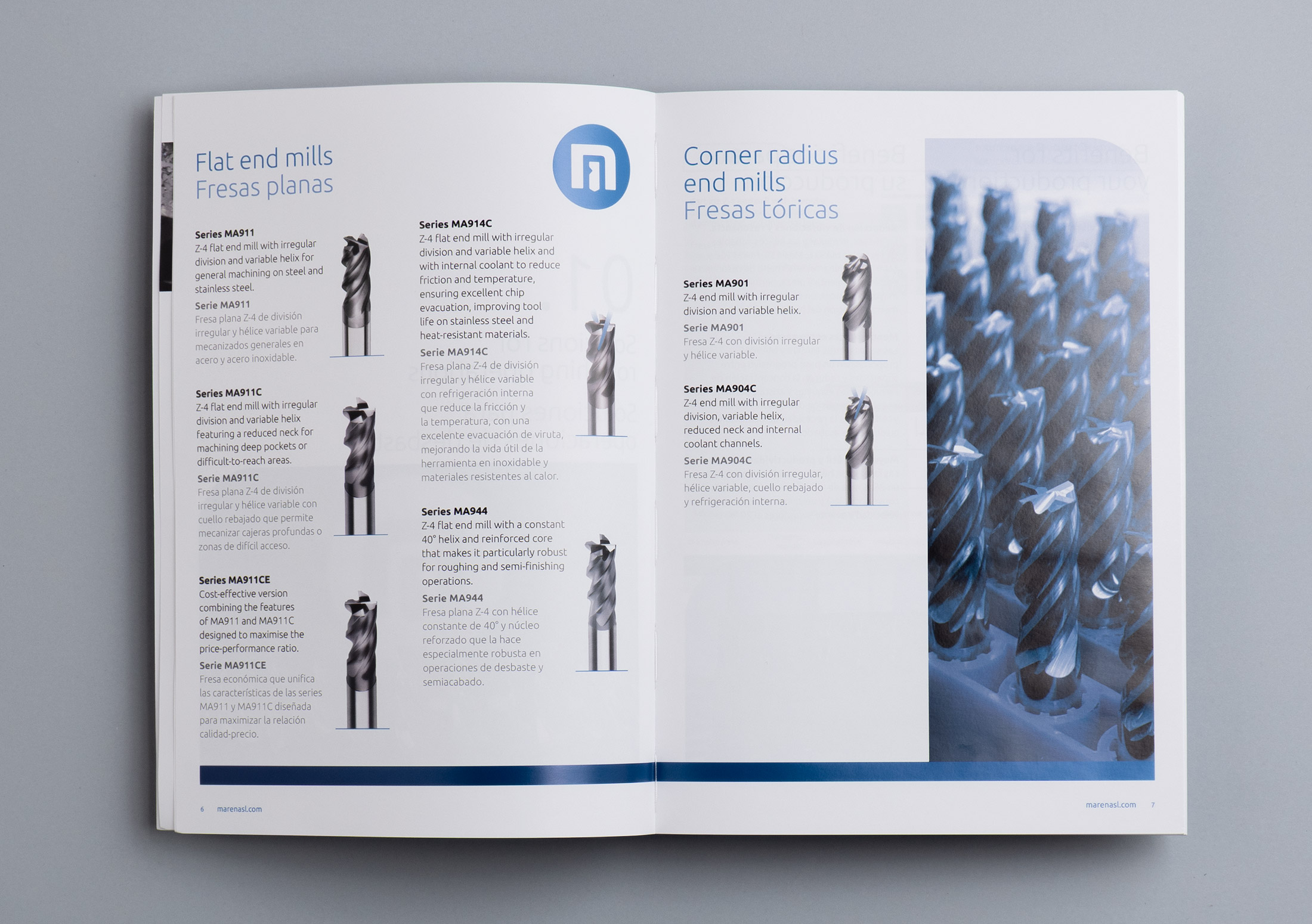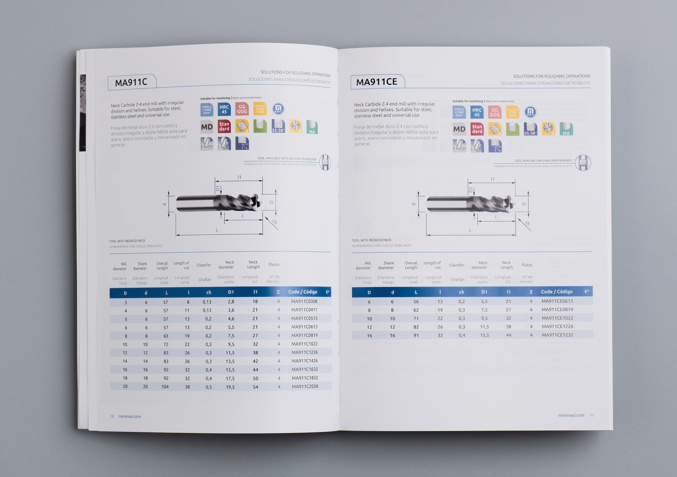 Marena nos pidió el diseño de un pequeño catálogo de herramientas: un extracto de 72 páginas del catálogo general. Esta nueva recopilación contiene herramientas agrupadas según su función en seis capítulos, algo que resultaba ser una nueva estrategia de marketing y necesitaba un cuidado especial en su desarrollo visual.