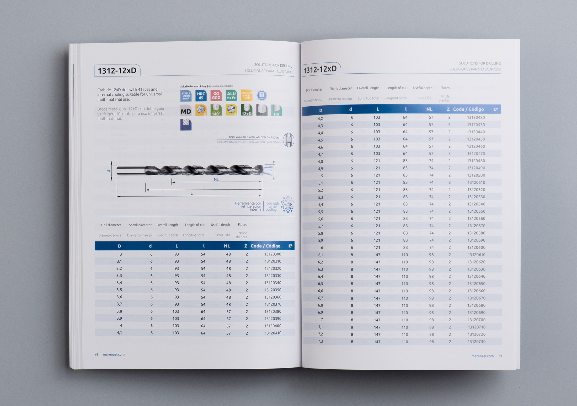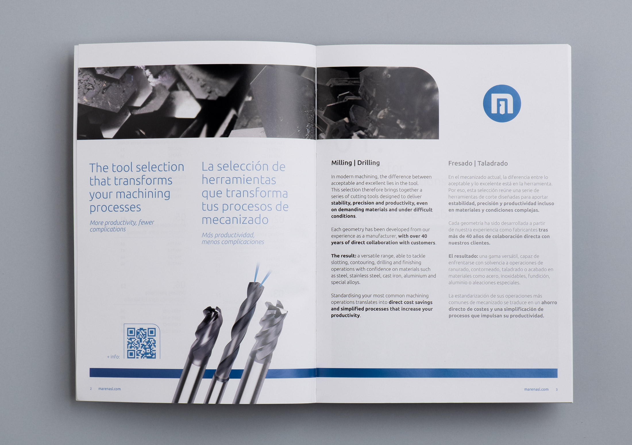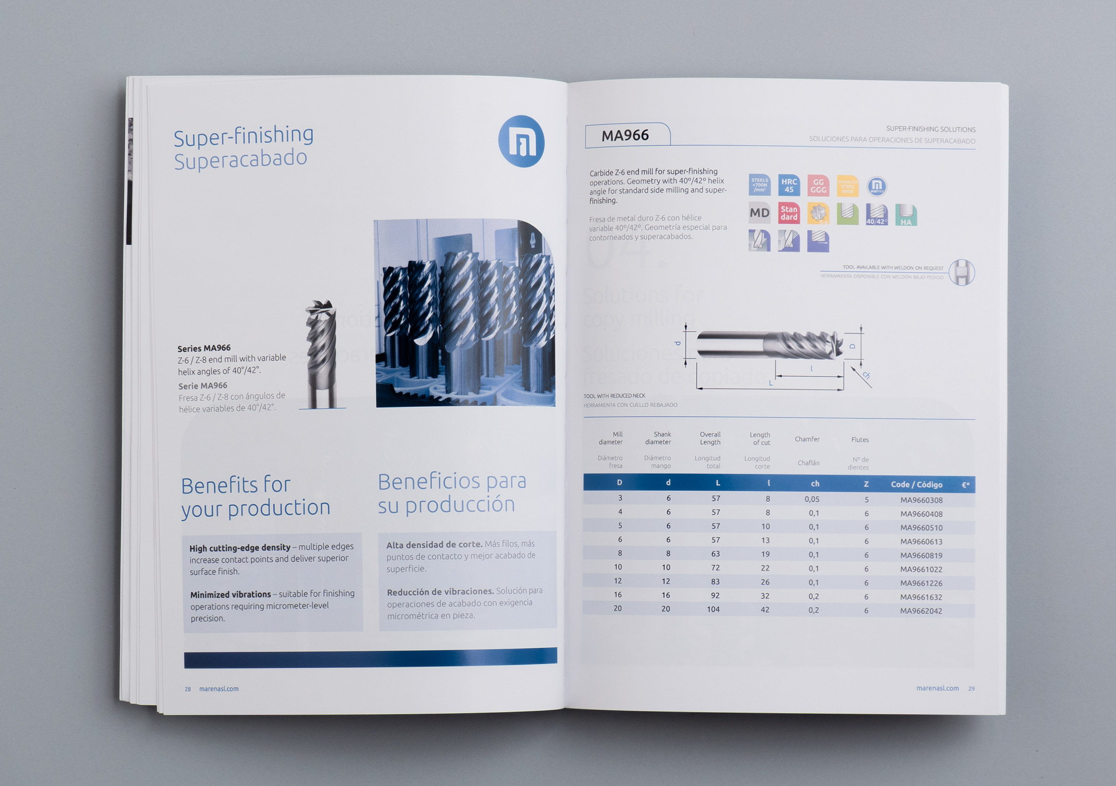 Marena nos pidió el diseño de un pequeño catálogo de herramientas: un extracto de 72 páginas del catálogo general. Esta nueva recopilación contiene herramientas agrupadas según su función en seis capítulos, algo que resultaba ser una nueva estrategia de marketing y necesitaba un cuidado especial en su desarrollo visual.